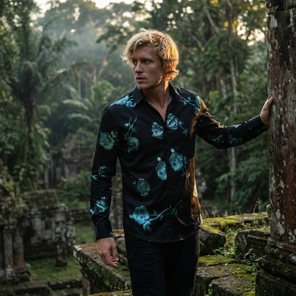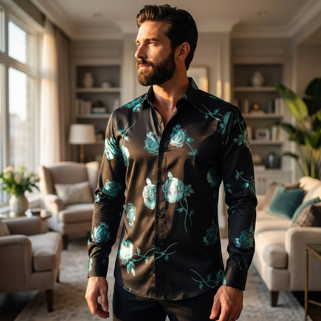 Men Floral Print Long Sleeve Shirt – 3D Digital Printed Stretch Slim Fit Urban Lapel Dress Shirt