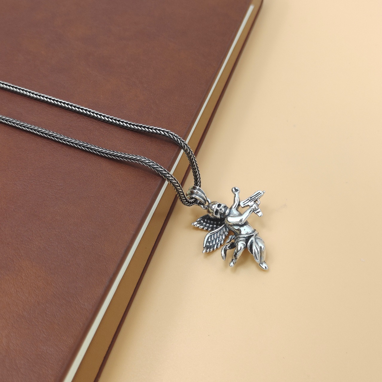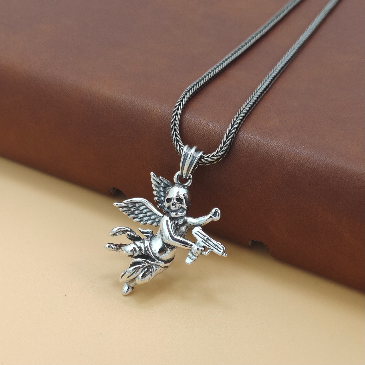 S925 Sterling Silver Vintage Skull & Angel Pendant - Geometric Gothic Jewelry (Seiko Crafted, Unisex Statement Necklace)