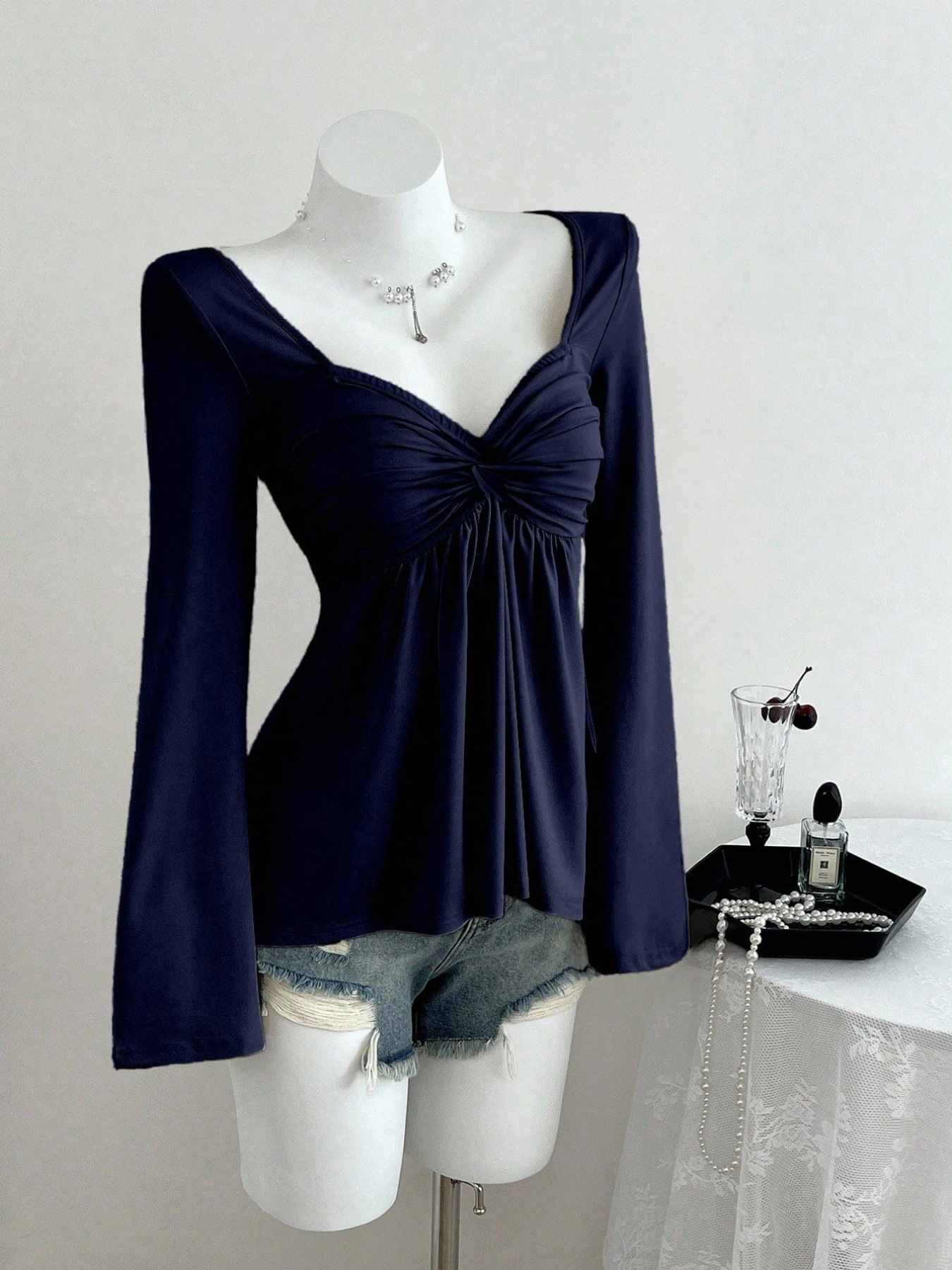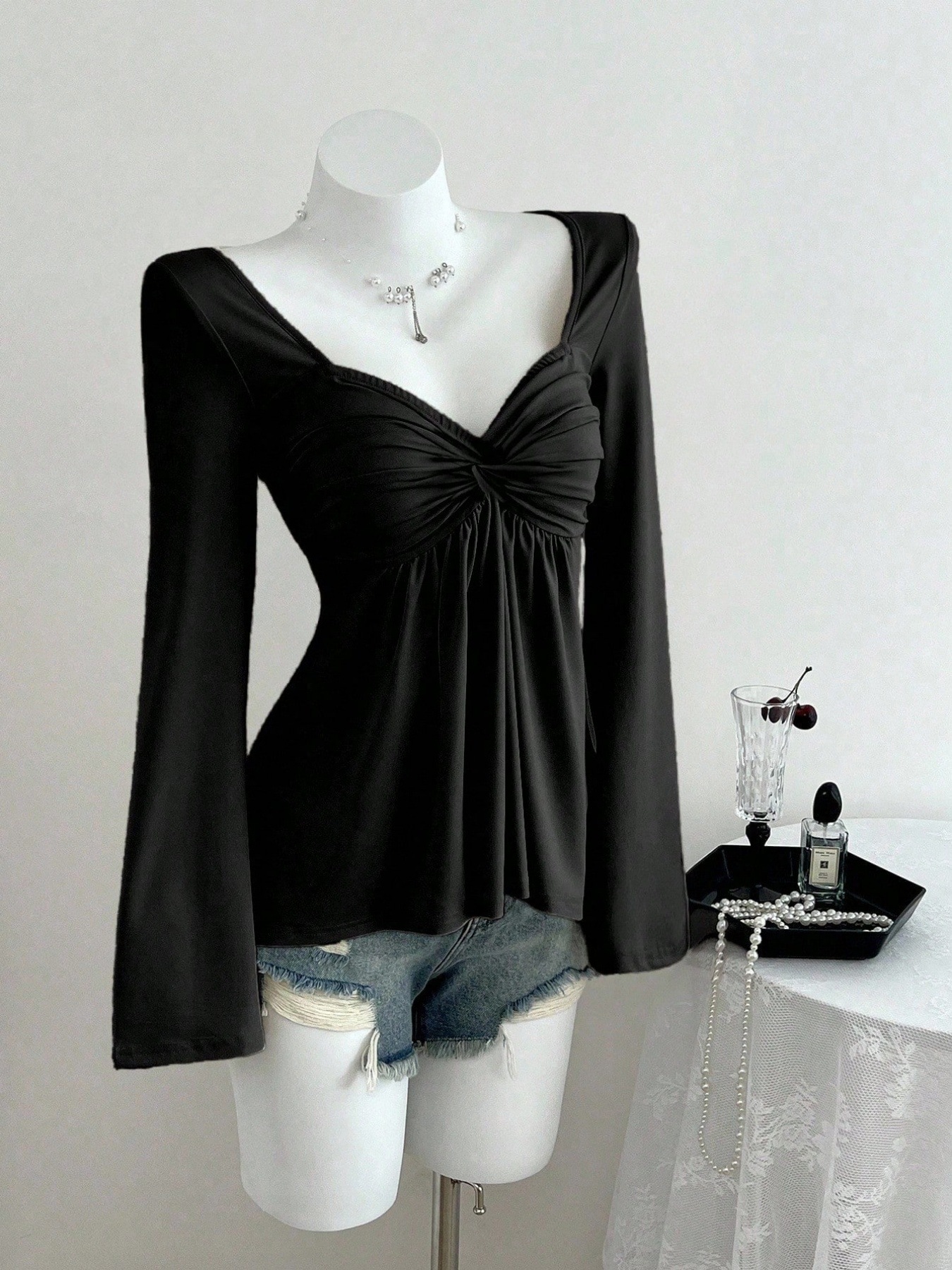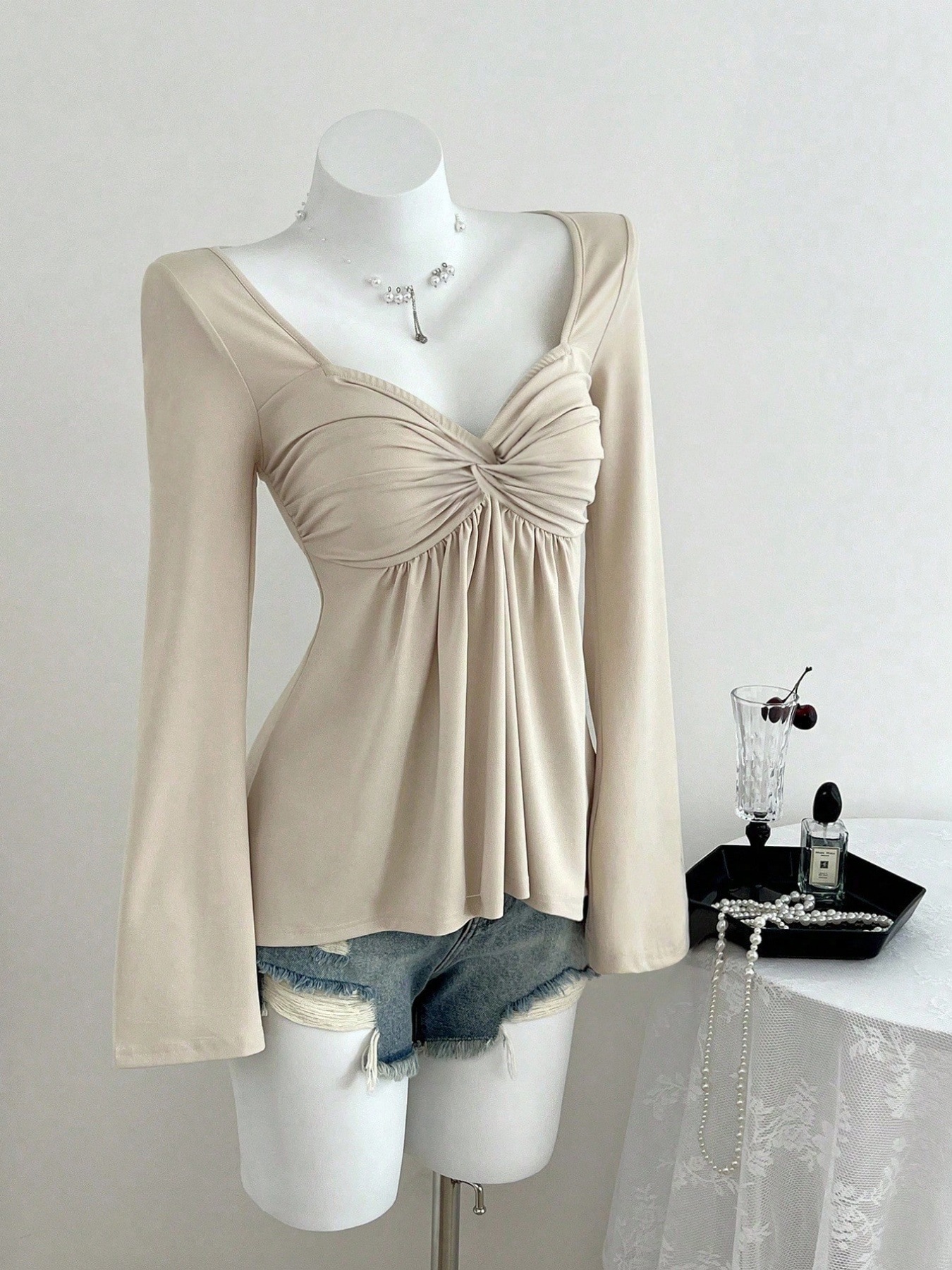 Women Elegant V-Neck Long Sleeve T-Shirt – Pleated Flared Sleeve Brushed Milk Silk Autumn Top