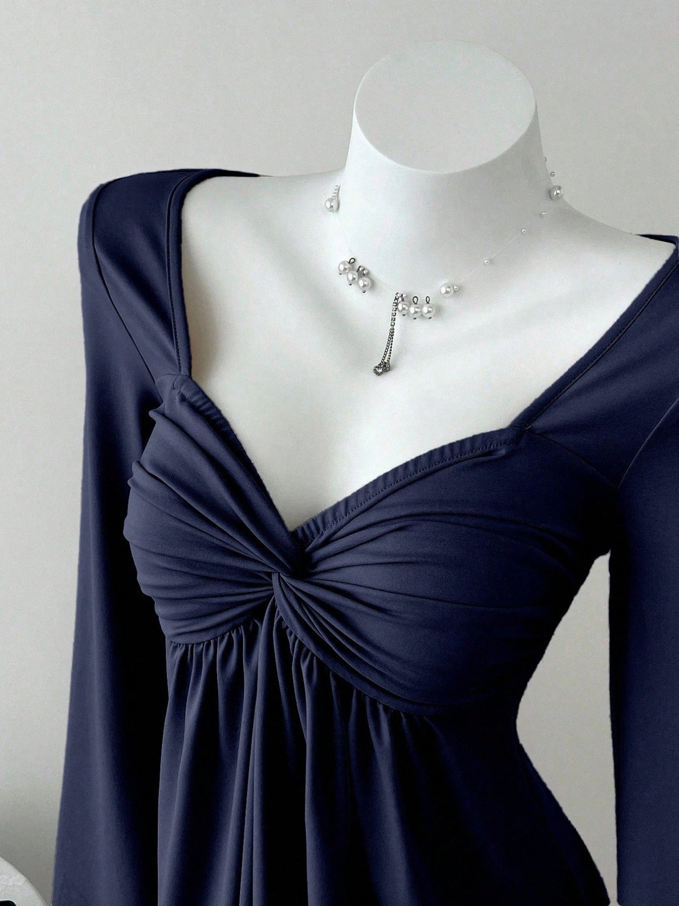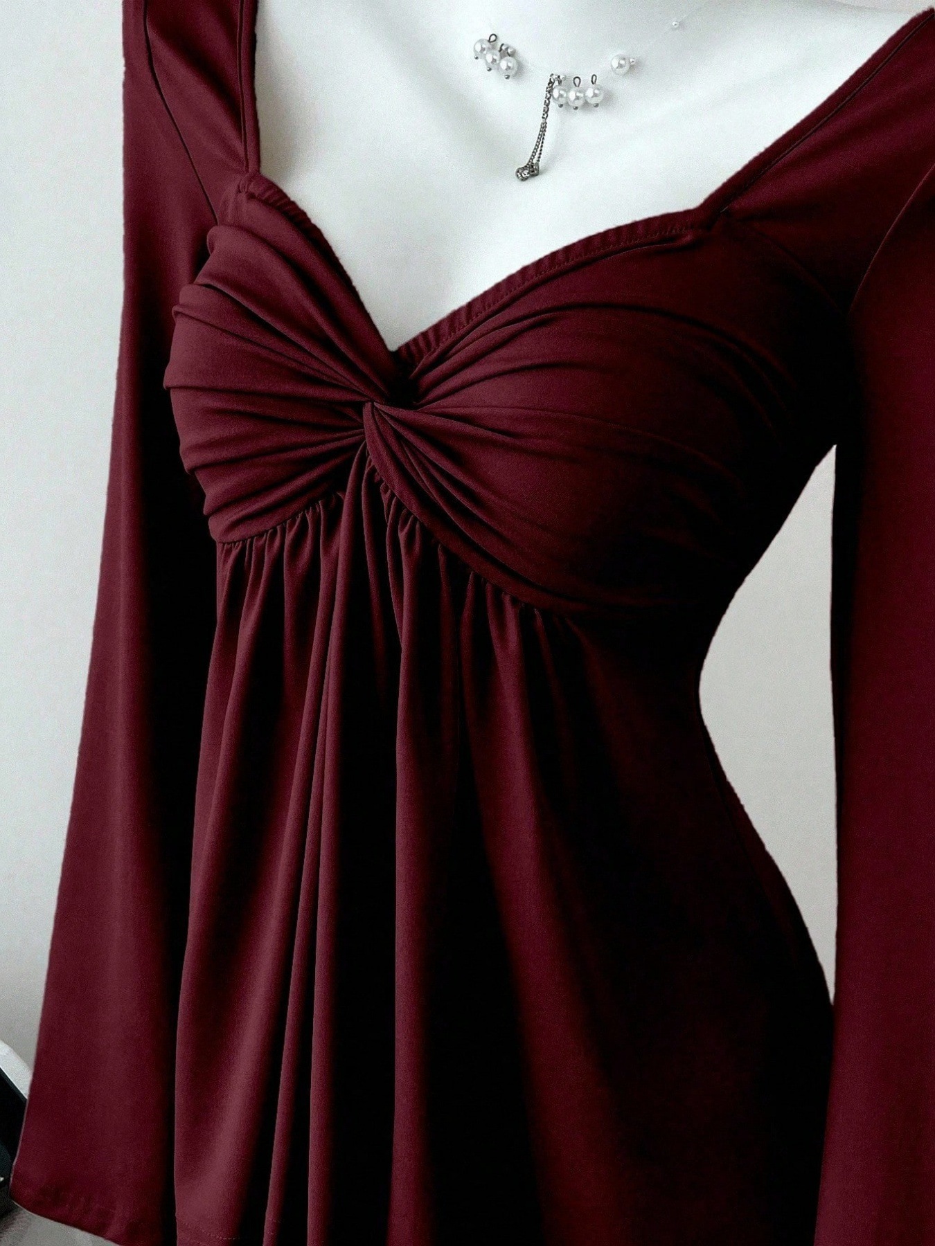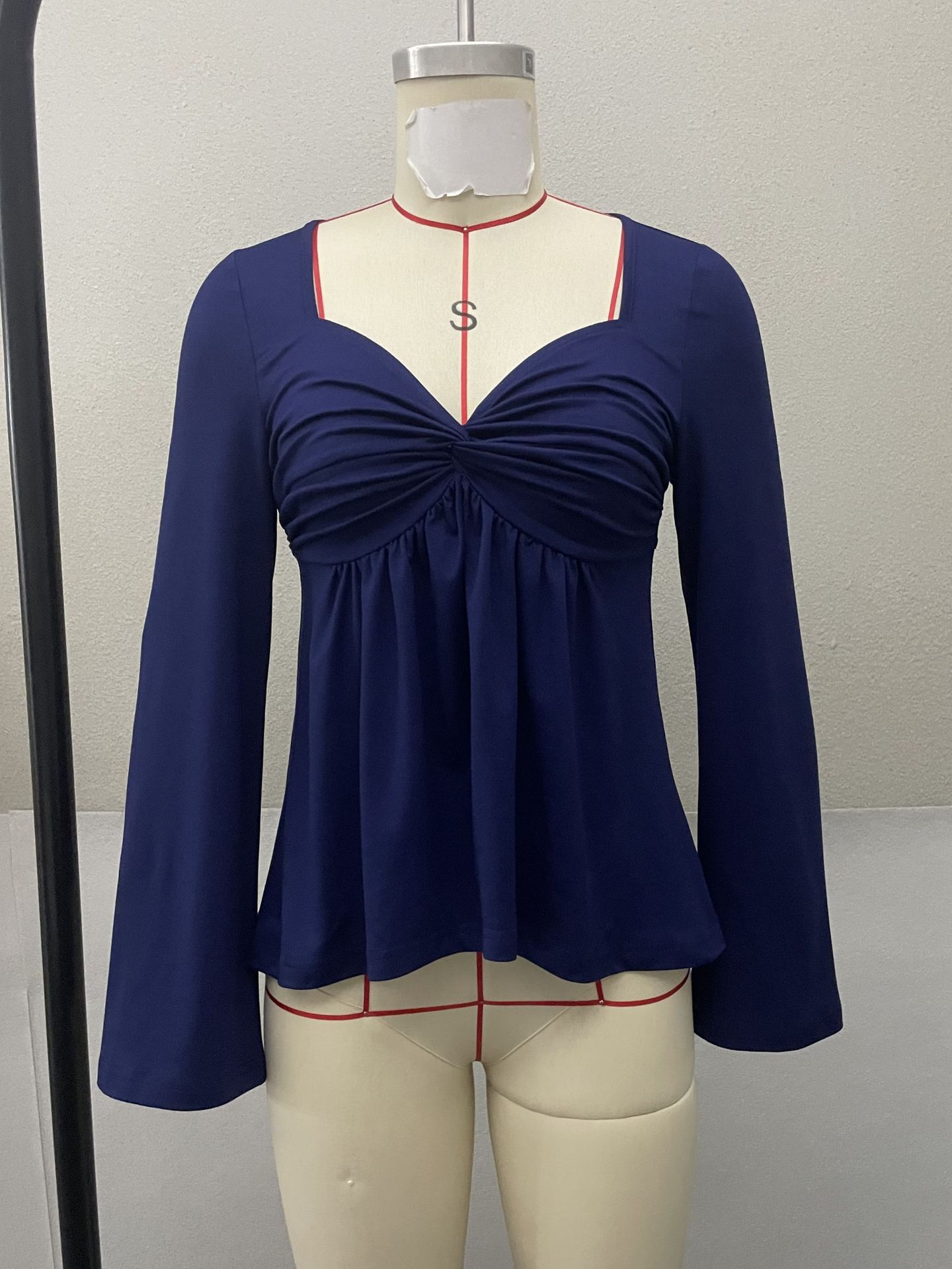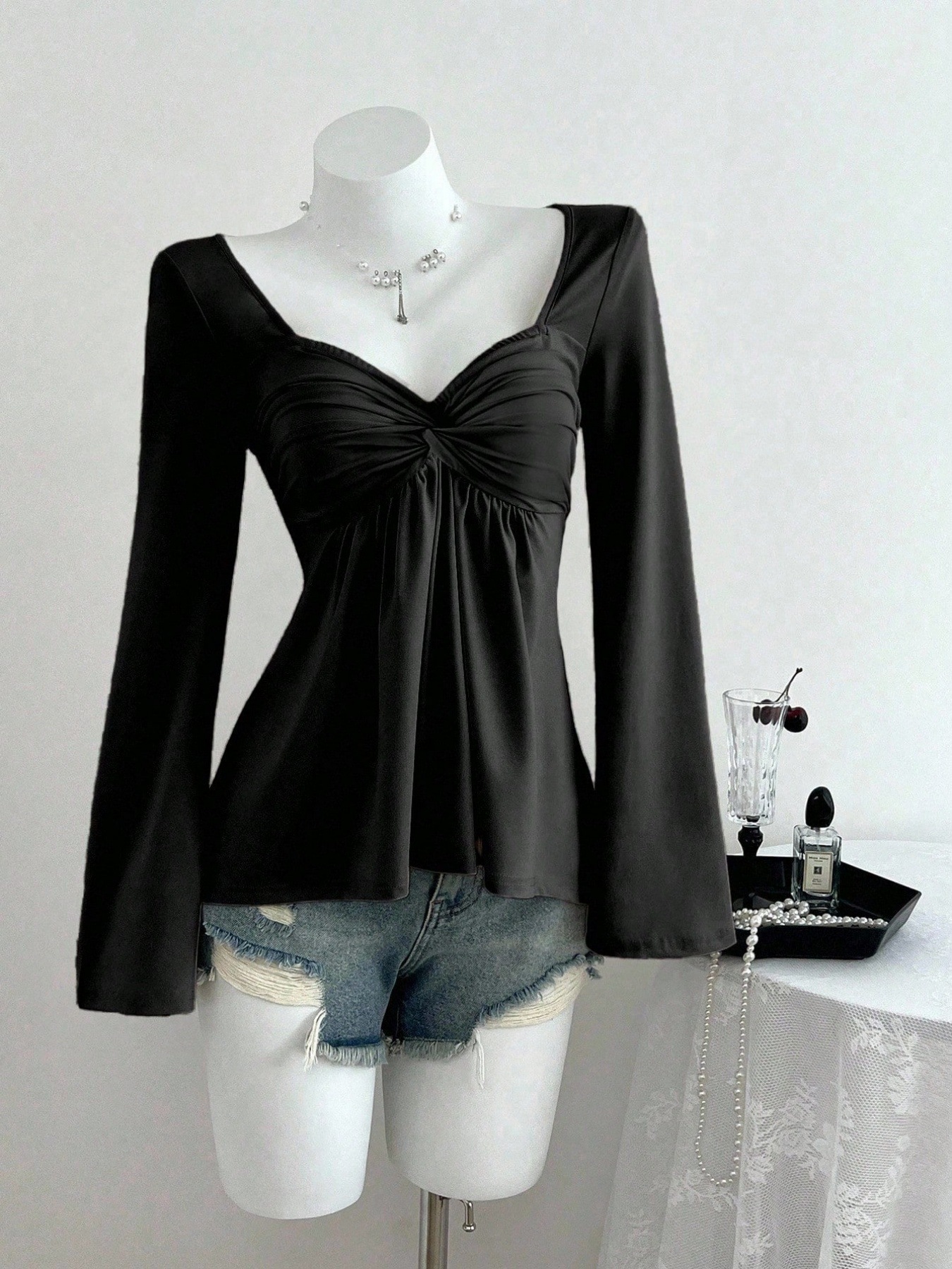 Women Elegant V-Neck Long Sleeve T-Shirt – Pleated Flared Sleeve Brushed Milk Silk Autumn Top