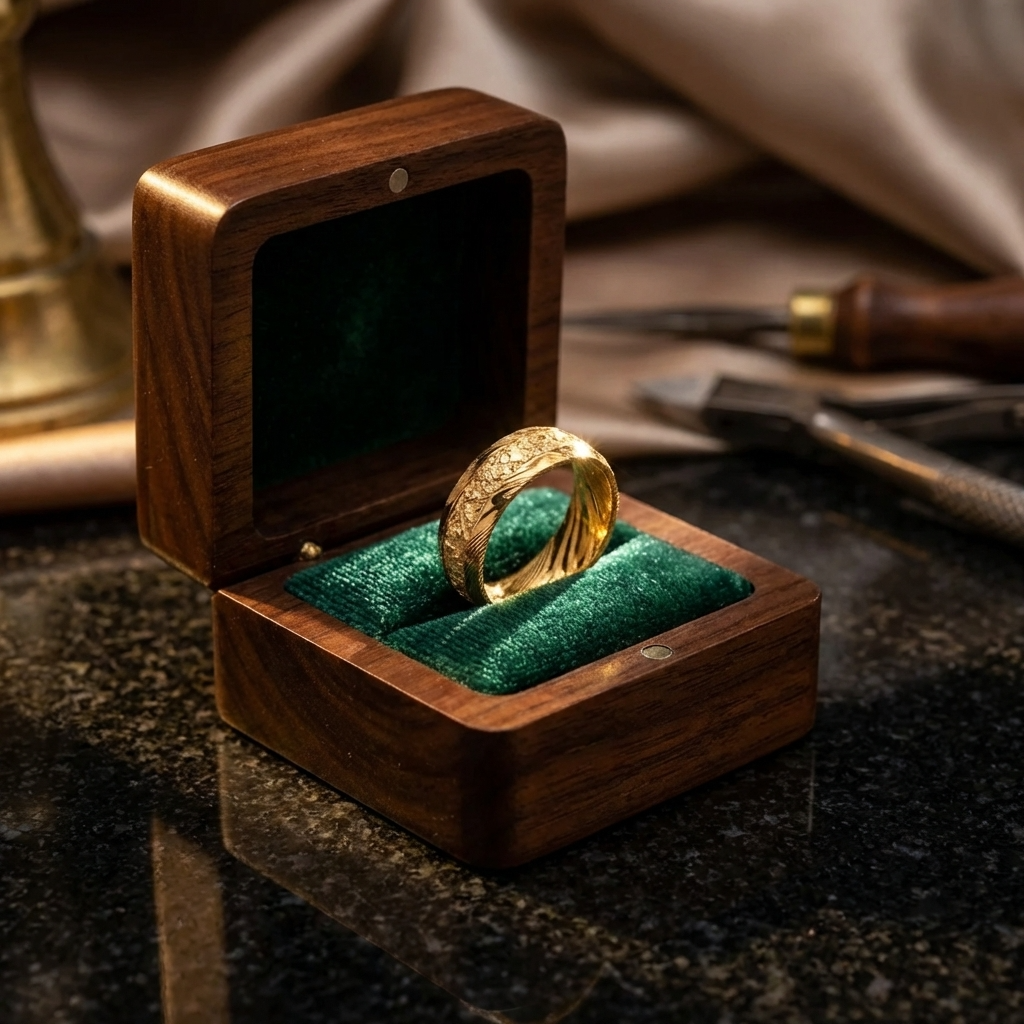 Men Gold Foil Damascus Steel Ring – Gold Plated Minimalist Geometric Wedding Band with Wavy Pattern Inlay