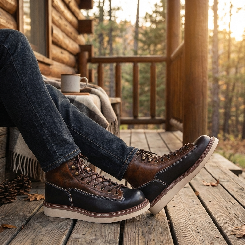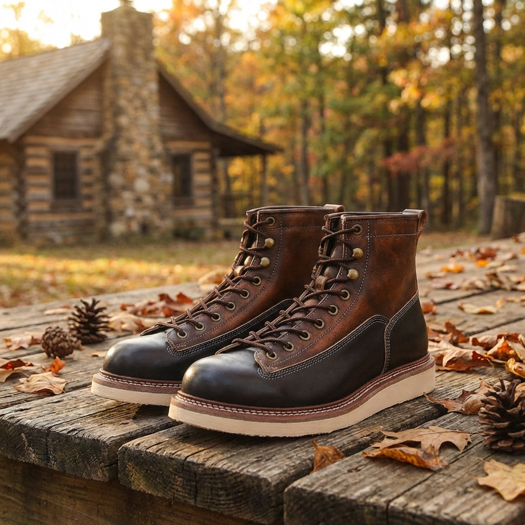 Men Genuine Leather Cowboy Work Boots – Premium Top-Grain Cowhide Lace-Up Motorcycle Western High-Top Ankle Boots