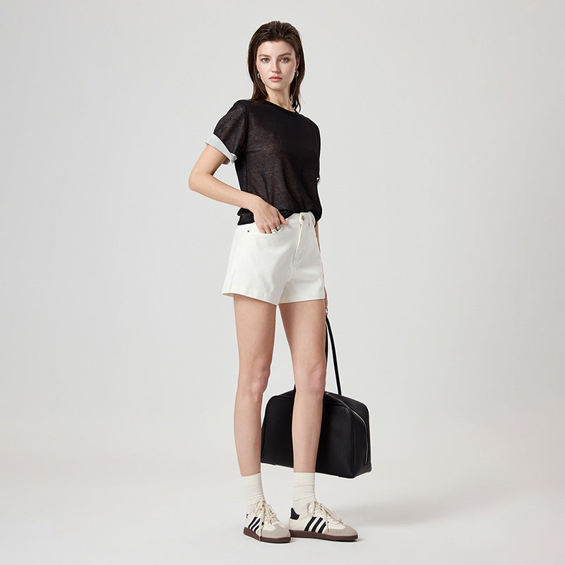 Women White Stretch Denim Shorts – Four-Way Stretch Slimming High-Rise Chenille Summer Casual Shorts