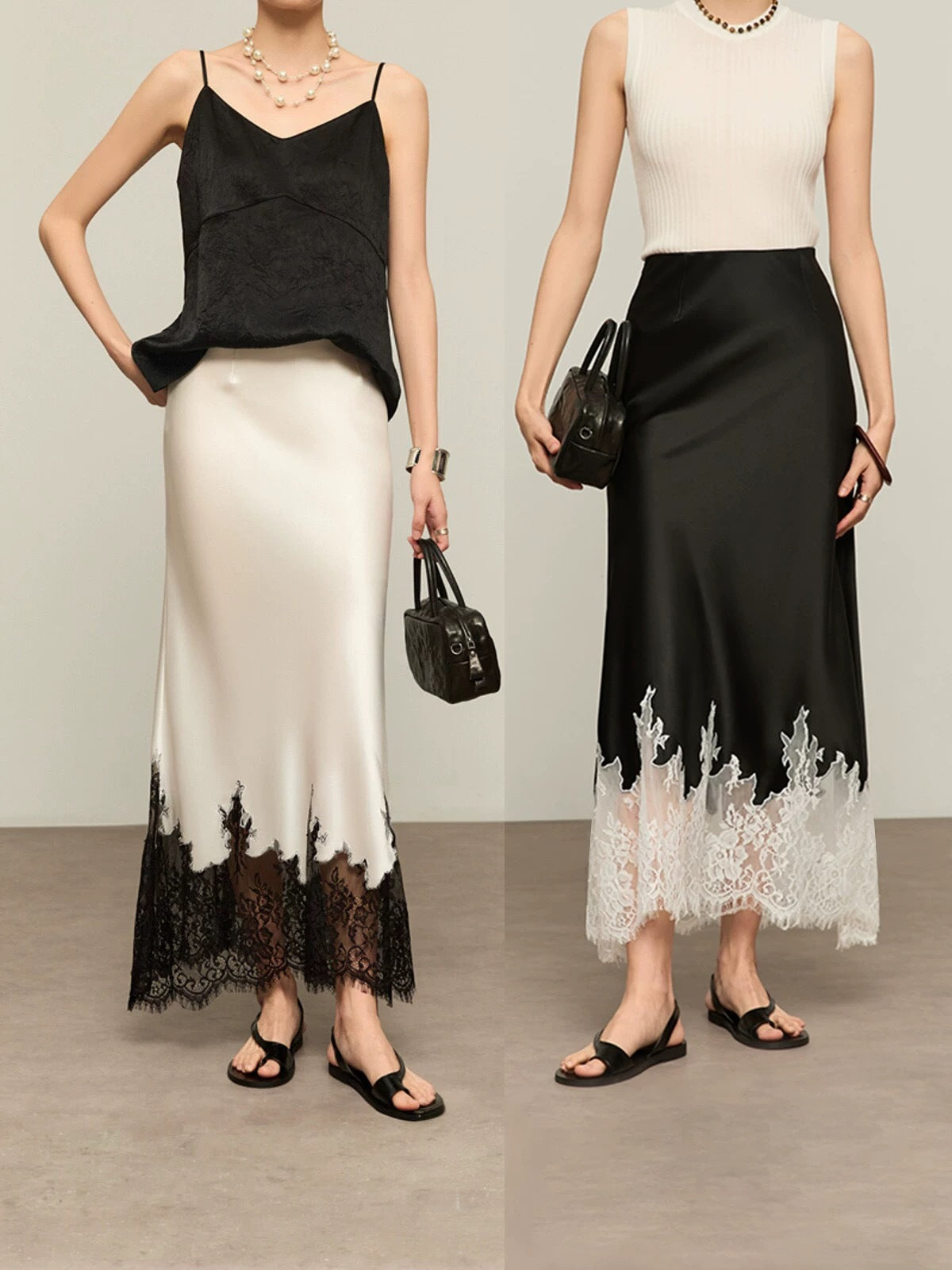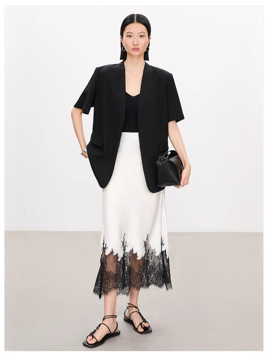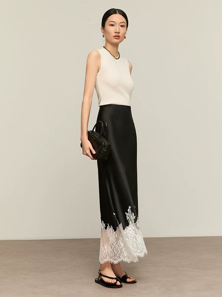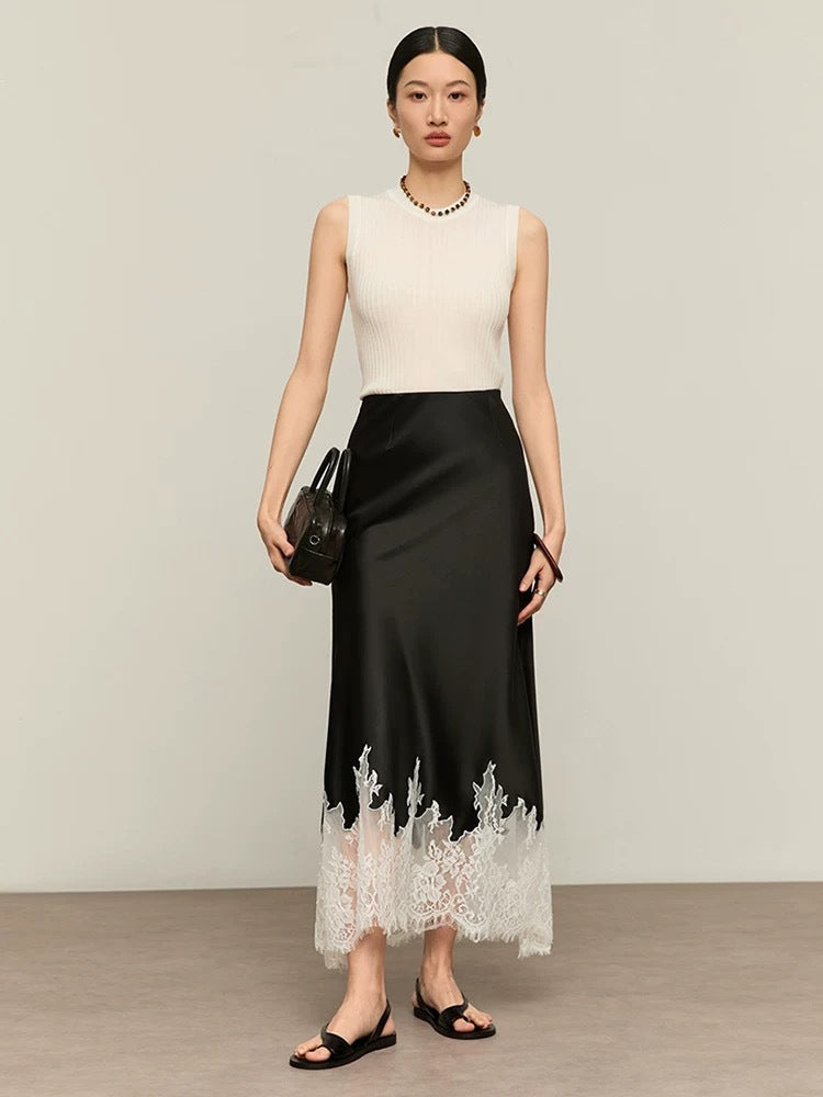 Women’s Lace Patchwork A-Line Skirt – Elegant Triacetate Mid-Calf Bias Cut Office Skirt