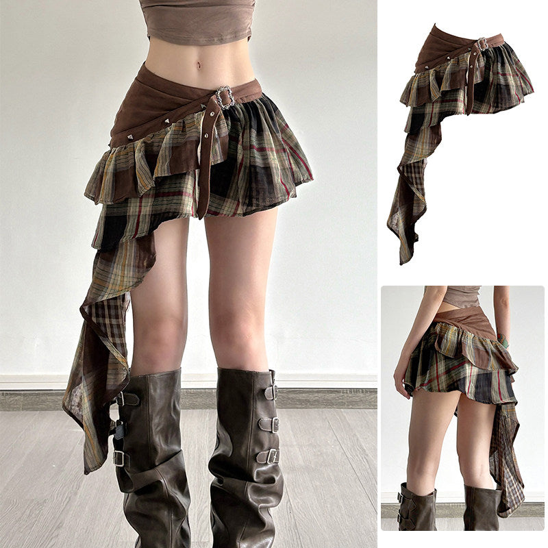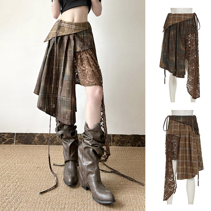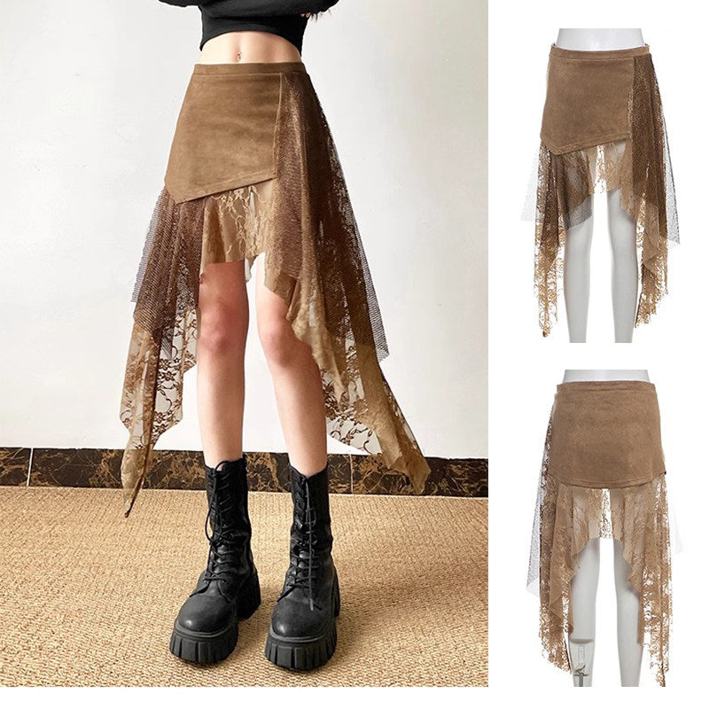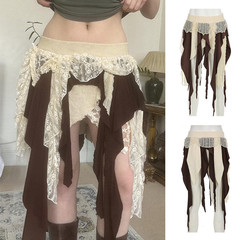 Women’s Asymmetrical High Waist A-Line Skirt – Ruffled Street Style Midi Skirt with Lace Detail & Slim Fit