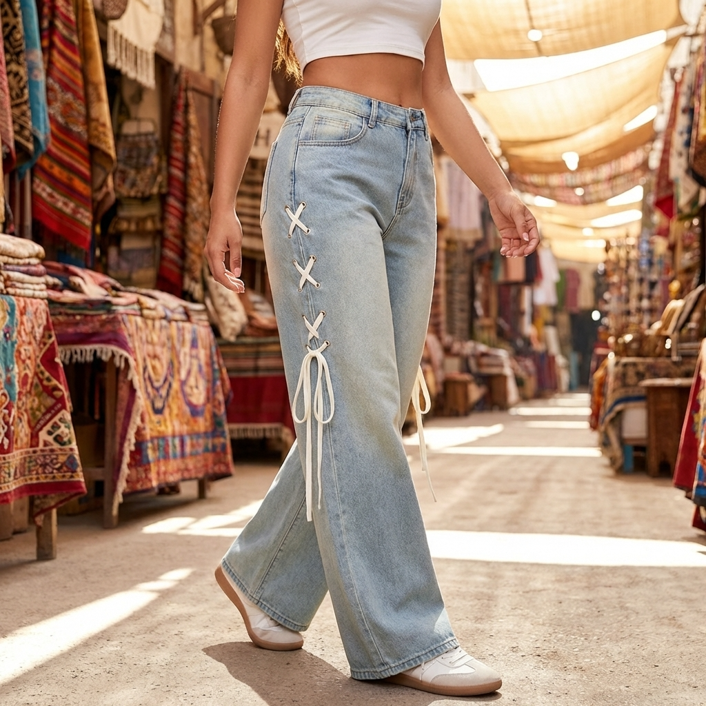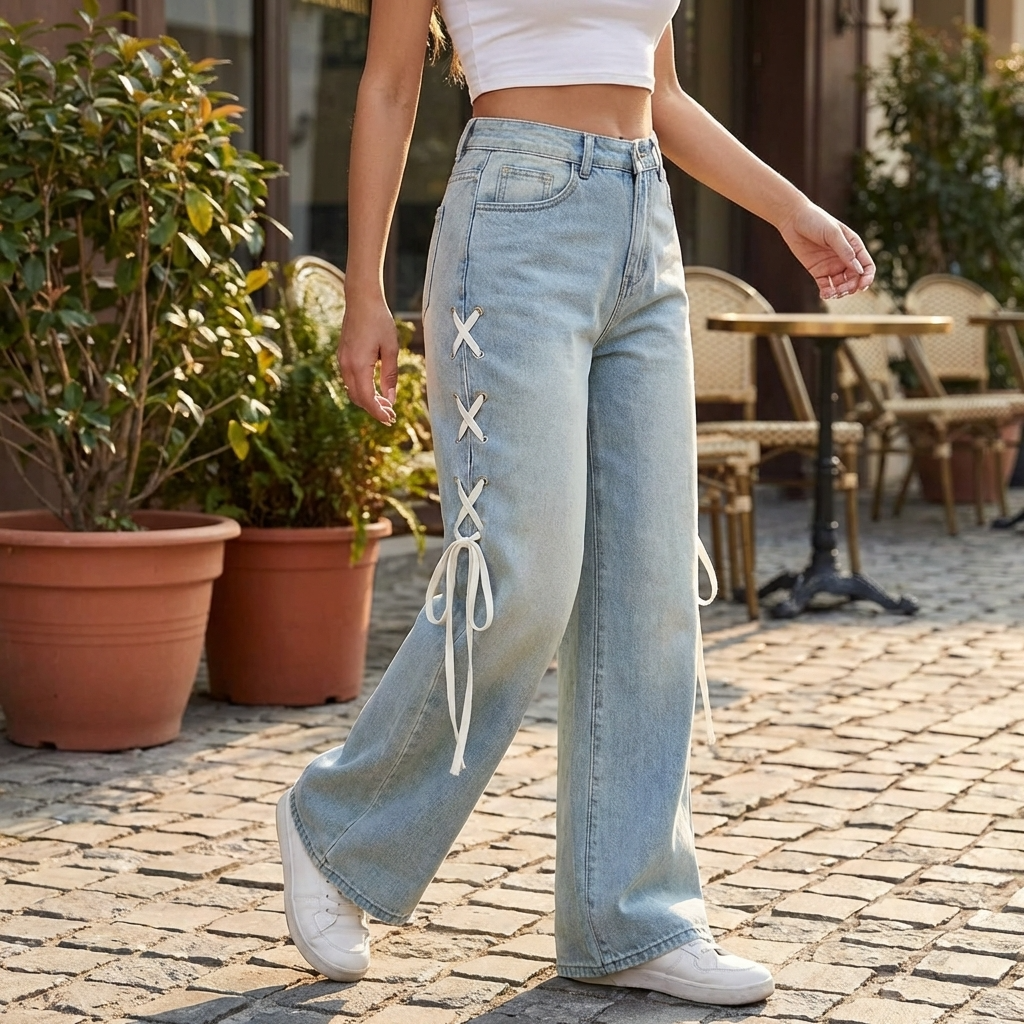 Women’s High-Waist Wide-Leg Jeans with Side Ribbon – Embroidered Loose Fit Denim Pants
