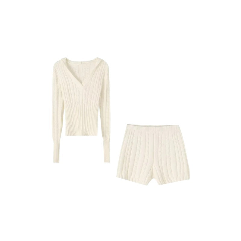 Women’s Knitted Hooded Sweater & Shorts Set – Casual Crop Top Lounge Suit