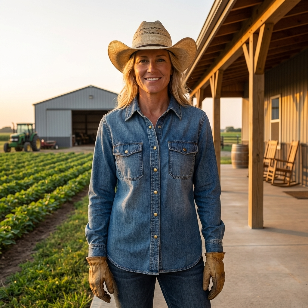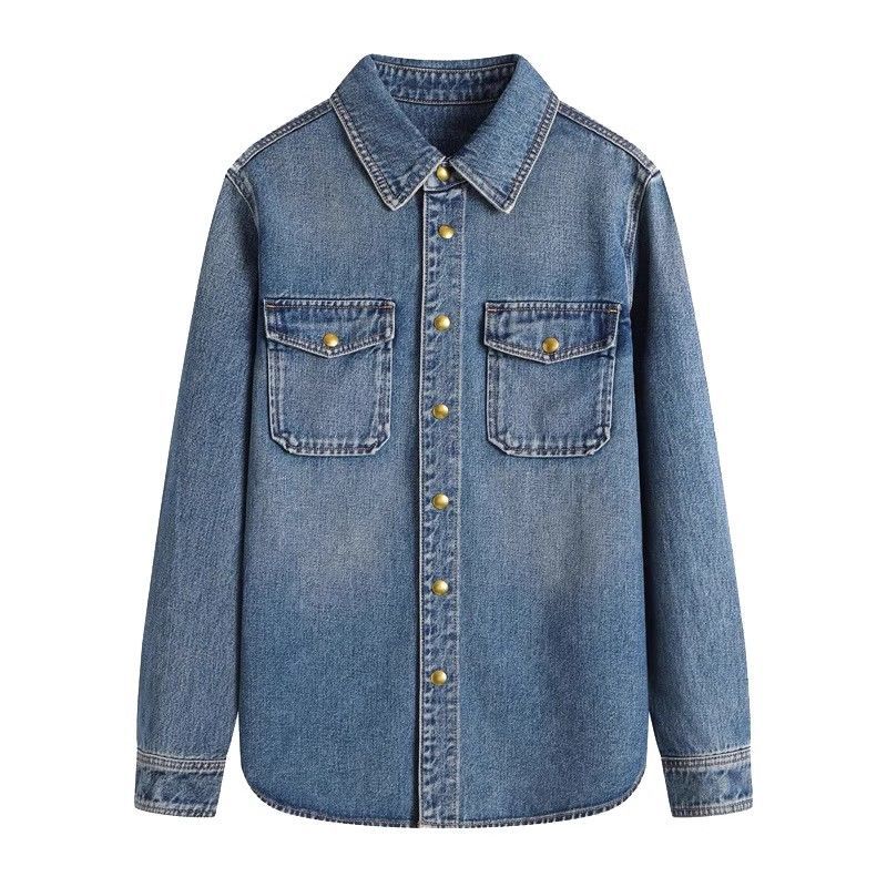 Women’s Cowboy Denim Shirt – Loose Fit Button-Up Western Style Top with Geometric Detail, Long Sleeves