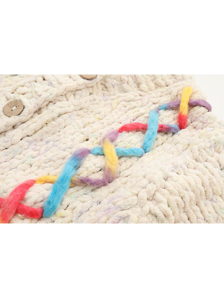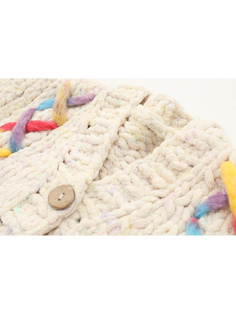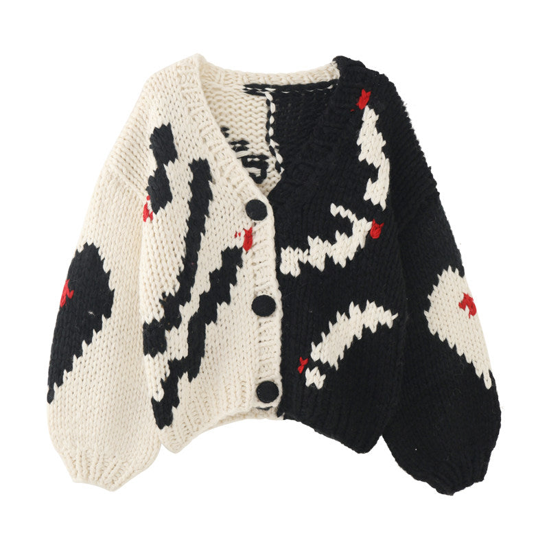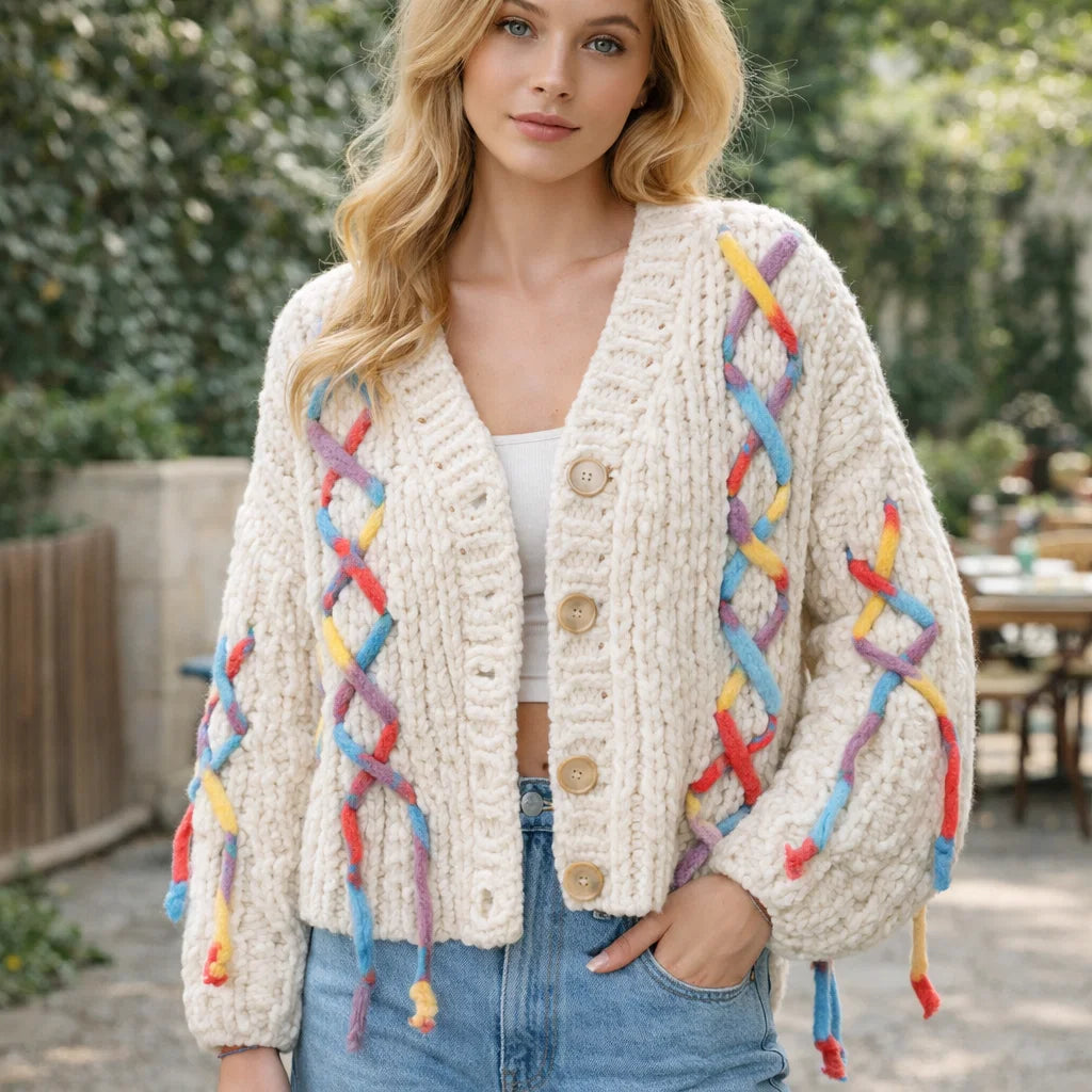 Women V-Neck Color-Blocked Knit Cardigan – French Style Handmade Cotton Blend Sweater