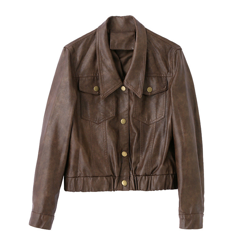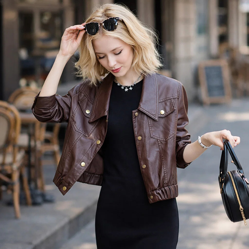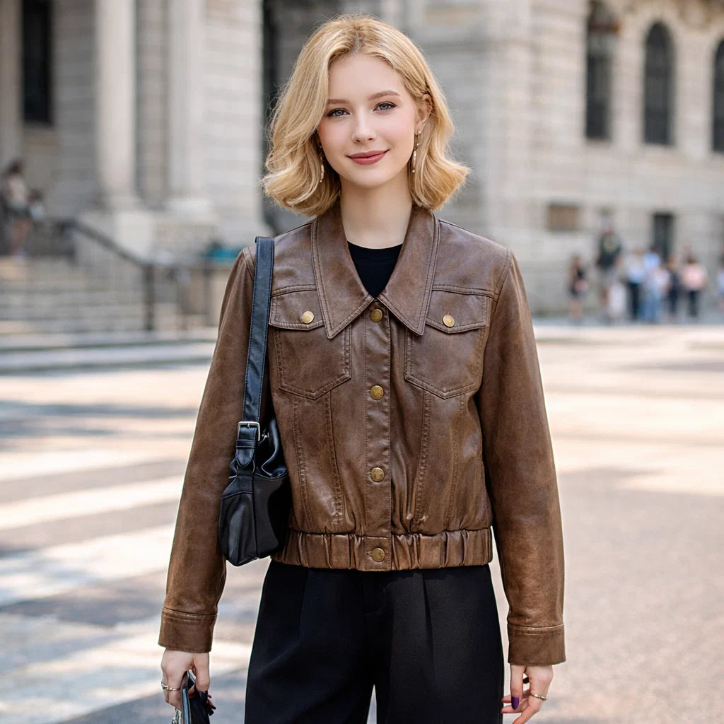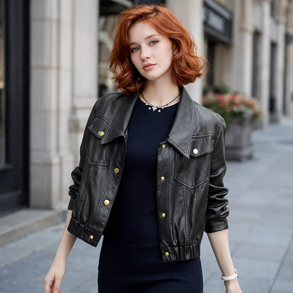 Women Short Goatskin Leather Jacket – Genuine Sheepskin Lapel Single-Breasted Urban Cropped Coat