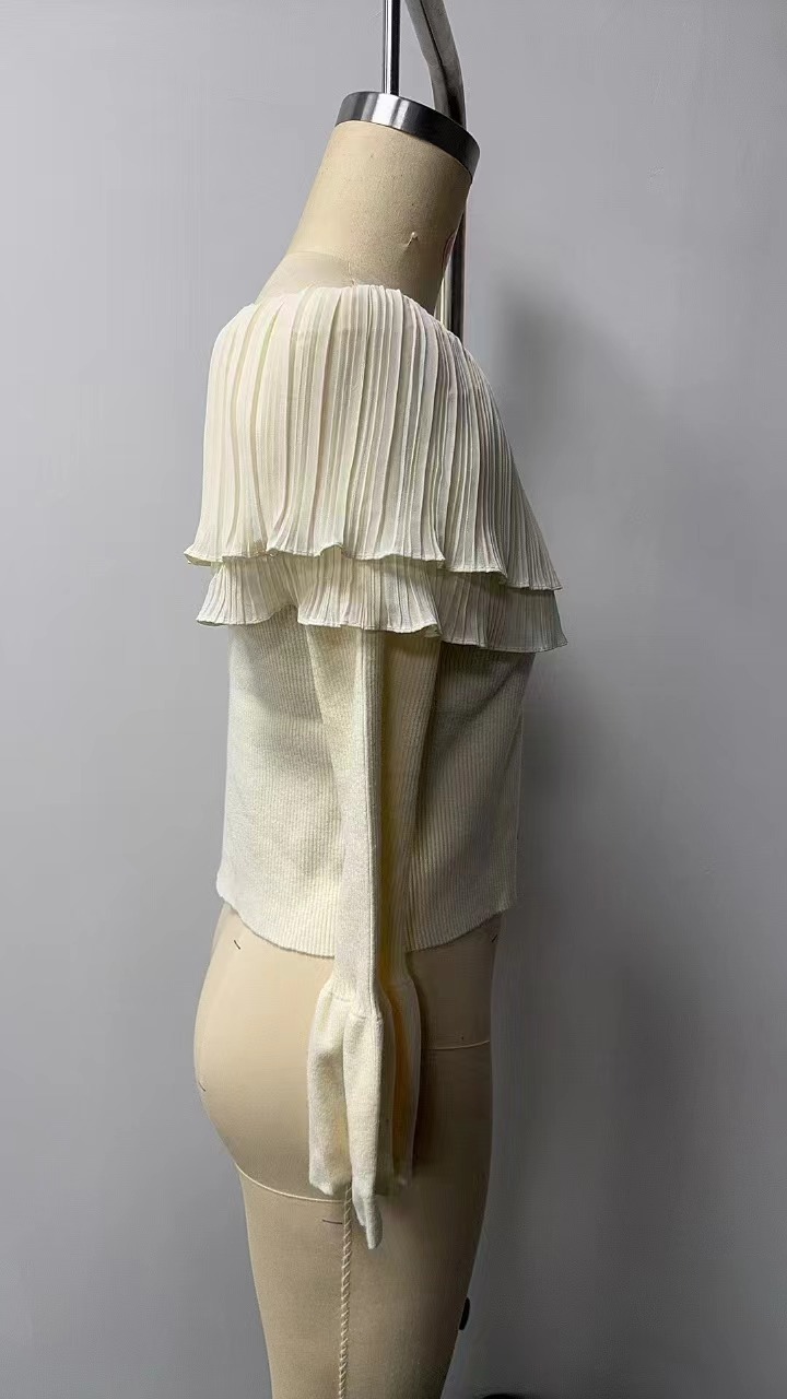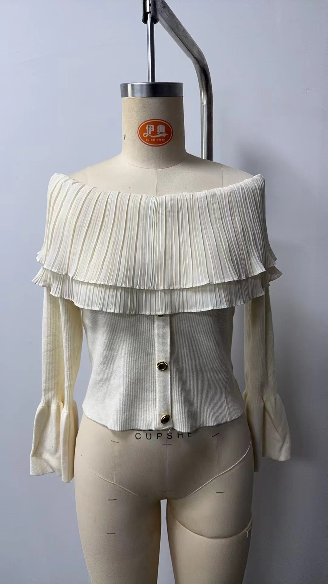 Women’s Off-Shoulder Clinched Splicing Knitwear – Elegant Long-Sleeve Bell-Sleeve Sweater Top