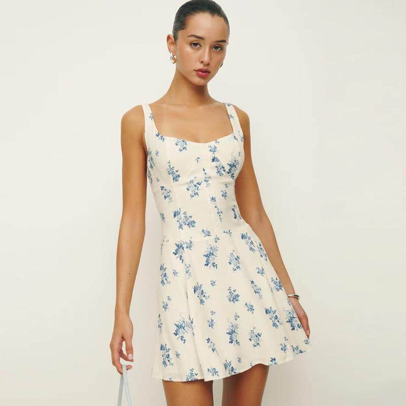 Women’s Square-Neck Open-Back Printed Suspender Dress – Fresh Sweet Floral A-Line Mini Dress