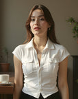 Women’s Slim Fit Polo Neck T-Shirt - High-Temperature Shaped Polyester Tee (Khaki/White, S-L) Casual Cardigan StylePolo Neck Short T-shirt