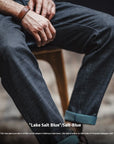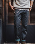 Men's Workwear Retro Jeans - Lake Blue Salt Washed Straight Leg Denim Pants (Mid-Rise Zip Fly) - 100% Cotton Rigid Denim for Youth