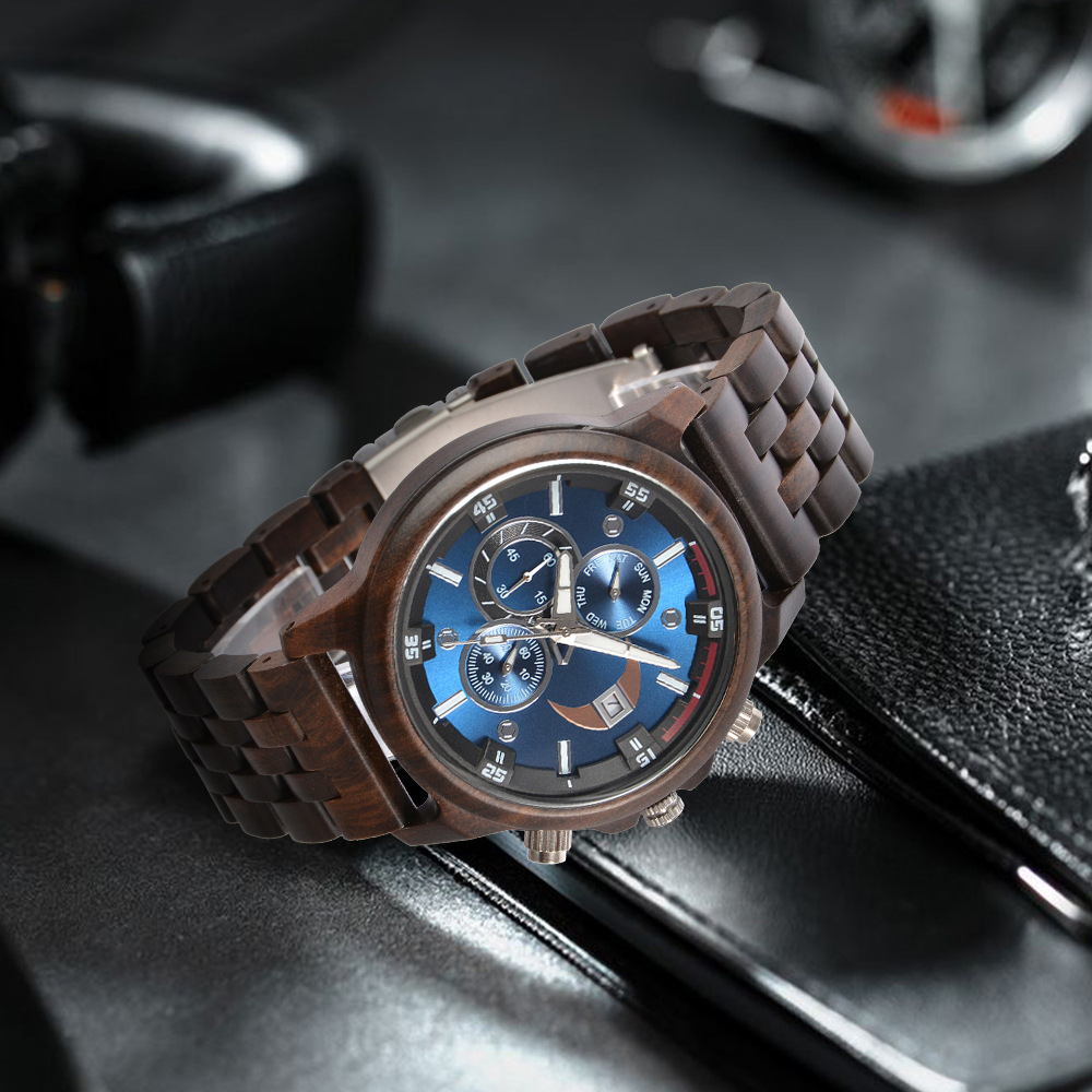 Men’s Natural Sandalwood Quartz Watch – Large Dial Chronograph, Minimalist Wooden Design