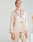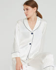 Pyjama en soie de mûrier 19 mm pour femme - Col à revers (blanc/abricot clair) - Vêtements de détente respirants de luxe (M-XL)
